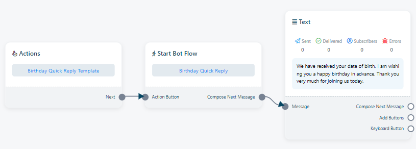 Birthday Reply: `Birthday Reply` is a pre-established message template that comes into play when a bot receives a user`s birthday date. Users have the option to set this Birthday Reply to use with any bot.
