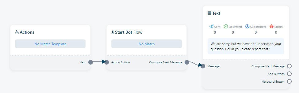 No Match Template: The `No Match Template` acts as a preset response or message that is delivered when the bot cannot locate a specific bot reply for particular keywords or messages. This template is useful for handling situations where the bot receives user messages that do not align with any predefined intents or commands. Users can customize this No Match bot response by clicking on `No Match` to tailor the bot`s reply to such situations.