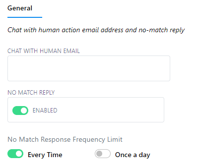 The no match reply response frequency limit for a bot account is the maximum number of times that the chatbot can respond with a `No Match Template` response. In this case, if the `Every Time` toggle button is on, then the chatbot will send the `No Match template` every time it can’t identify the proper response. In the other case, if the `Once a day` toggle button is selected, then the chatbot will send the `No Match template` only once a day if it can’t match any bot replies.